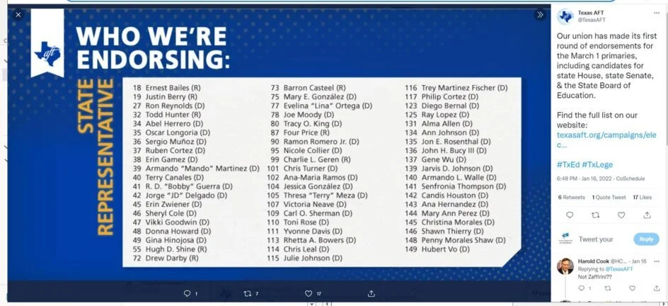 As a reminder, Parent Empowerment supporting legislators attempted multiple times to give BILLIONS to teachers in House Bill 100 this spring, but were blocked by nefarious union-backed legislators. Curious who those legislators are blocking money for teachers and kids? Well, just look at Randi Weingarten’s American Federation for Teachers 2022 Endorsement list to get a pretty darn good idea: